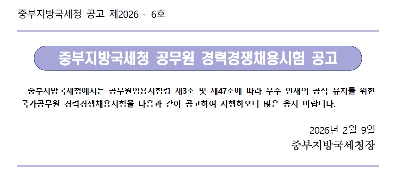 중부지방국세청 공고 제2026 - 6호 중부지방국세청 공무원 경력경쟁채용시험 공고 중부지방국세청에서는 공무원임용시험령 제3조 및 제47조에 따라 우수 인재의 공직 유치를 위한 국가공무원 경력경쟁채용시험을 다음과 같이 공고하여 시행하오니 많은 응시 바랍니다. 2026년 2월 9일 중부지방국세청장