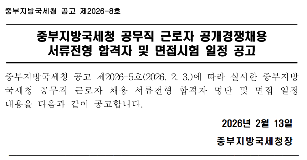중부지방국세청 공무직 근로자 공개경쟁채용 서류전형 합격자 및 면접시험 일정 공고