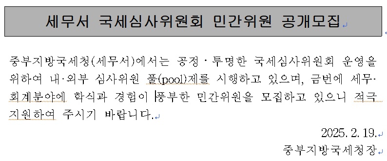 세무서 국세심사위원회 민간위원 공개모집 중부지방국세청(세무서)에서는 공정ㆍ투명한 국세심사위원회 운영을 위하여 내‧외부 심사위원 풀(pool)제를 시행하고 있으며, 금번에 세무·회계분야에 학식과 경험이 풍부한 민간위원을 모집하고 있으니 적극 지원하여 주시기 바랍니다. 2025.2.19. 중부지방국세청장