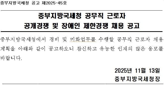 중부지방국세청 공고 제2025-45호 중부지방국세청 공무직 근로자 공개경쟁 및 장애인 제한경쟁 채용 공고 중부지방국세청에서 경비 및 미화업무를 수행할 공무직 근로자 채용 계획을 아래와 같이 공고하오니 참신하고 유능한 인재의 많은 응모를 바랍니다. 2025년 11월 13일 중부지방국세청장