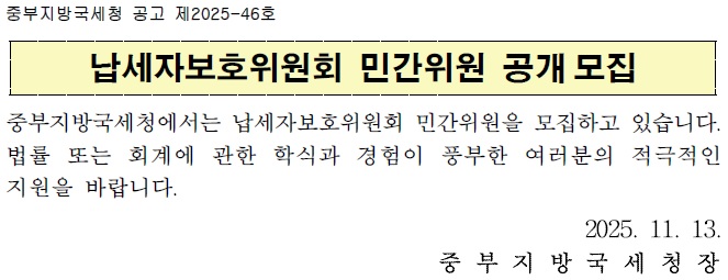 중부지방국세청 공고 제2025-46호 납세자보호위원회 민간위원 공개모집 중부지방국세청에서는 납세자보호위원회 민간위원을 모집하고 있습니다. 법률 또는 회계에 관한 학식과 경험이 풍부한 여러분의 적극적인 지원을 바랍니다. 2025. 11. 13. 중 부 지 방 국 세 청 장