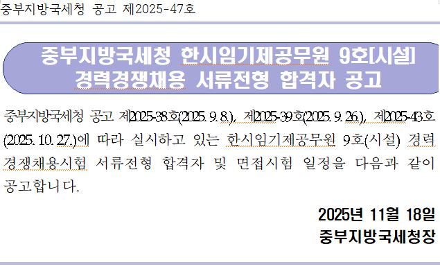 중부지방국세청 공고 제2025-47호 중부지방국세청 한시임기제공무원 9호[시설] 경력경쟁채용 서류전형 합격자 공고 중부지방국세청 공고 제2025-38호(2025.9.8.), 제2025-39호(2025.9.26.), 제2025-43호(2025.10.27.)에 따라 실시하고 있는 한시임기제공무원 9호(시설) 경력경쟁채용시험 서류전형 합격자 및 면접시험 일정을 다음과 같이 공고합니다. 2025년 11월 18일 중부지방국세청장