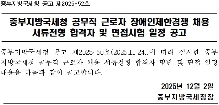 중부지방국세청 공고 제2025-52호 중부지방국세청 공무직 근로자 장애인제한경쟁 채용 서류전형 합격자 및 면접시험 일정 공고 중부지방국세청 공고 제2025-50호(2025.11.24.)에 따라 실시한 중부지방국세청 공무직 근로자 채용 서류전형 합격자 명단 및 면접 일정 내용을 다음과 같이 공고합니다. 2025년 12월 2일 중부지방국세청장