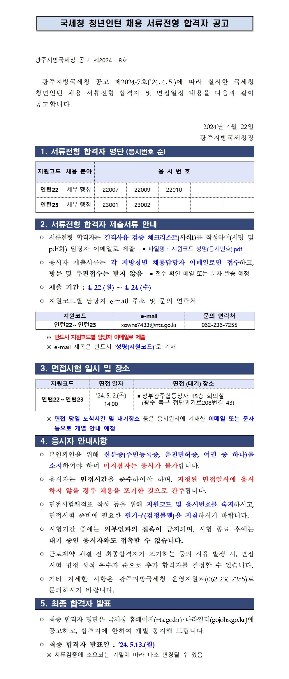 국세청 청년인턴 채용 서류전형 합격자 공고