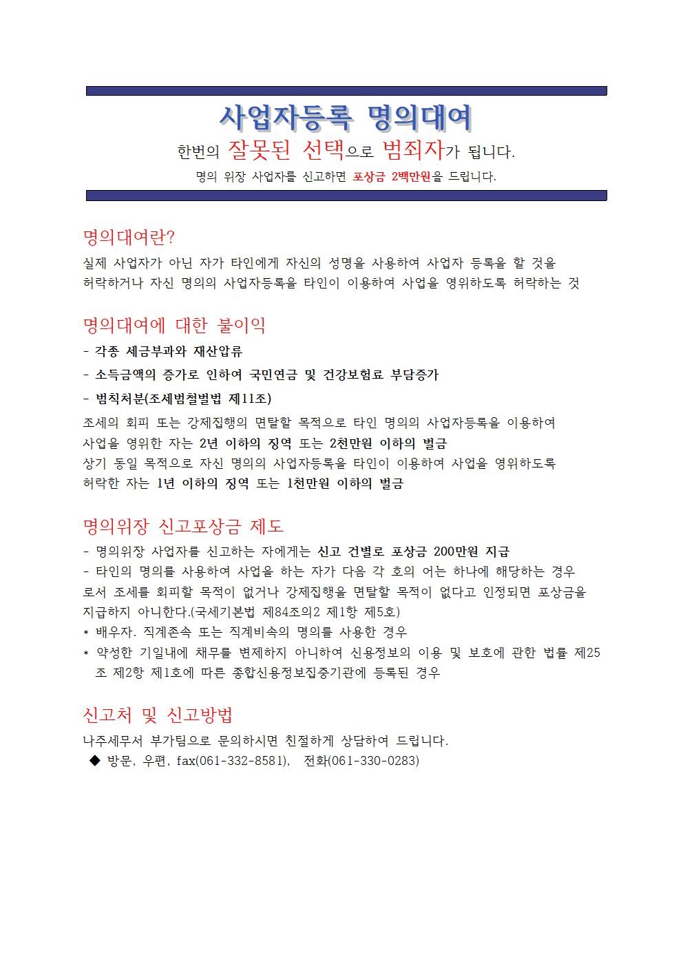사업자등록 명의대여, 한번의 잘못된 선택으로 범죄자가 됩니다.