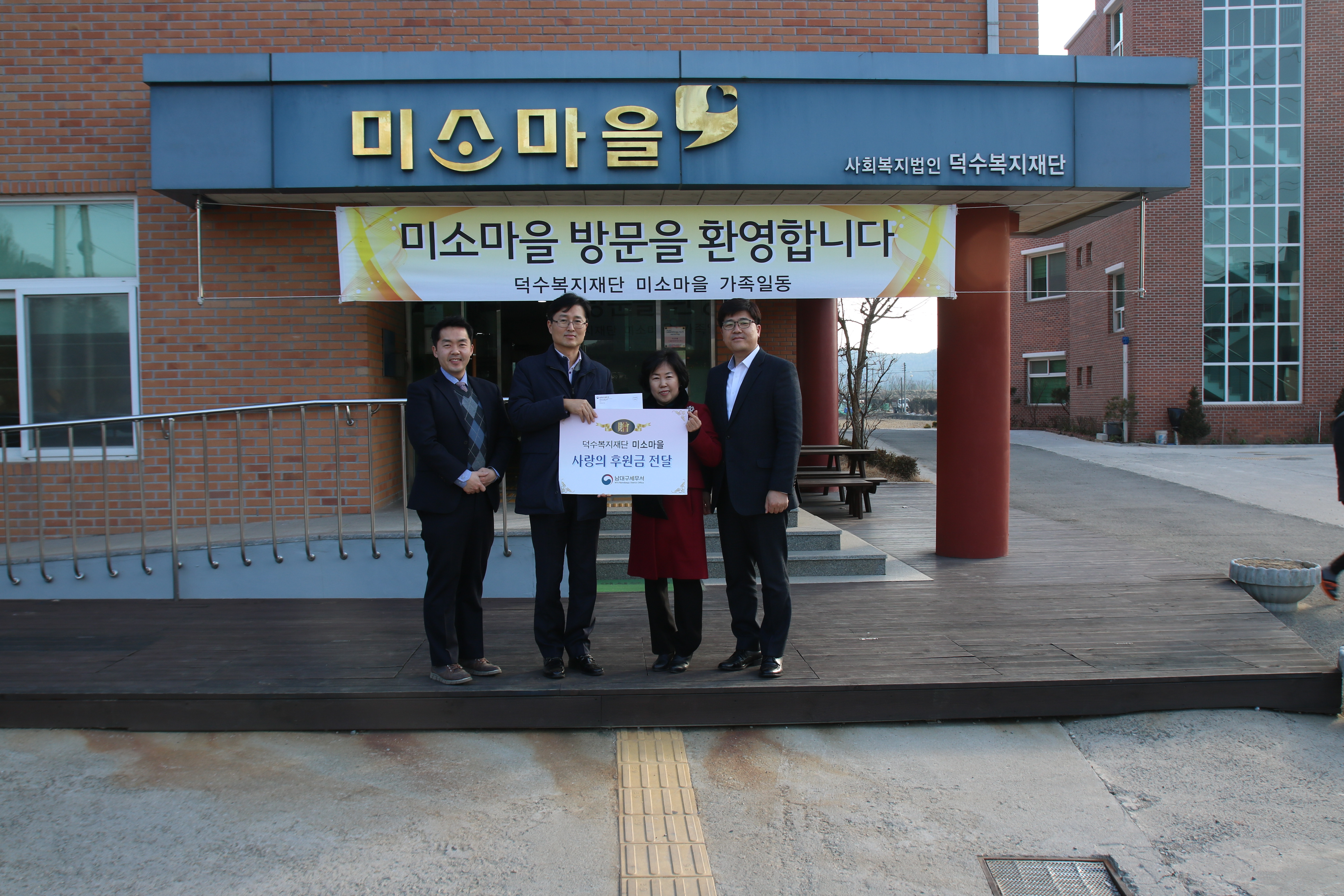 남대구세무서장을 대신하여 운영지원과(과장 용환희), 개인납세1과(과장 민종인), 개인납세2과(과장 변월수), 재산세과(과장 황동율)는 각각 지난 1월 30일 덕수복지재단 미소마을, 1월 31일 남구종합사회복지관, 에덴 그룹 홈, 해맑은 아이들의 집 그룹 홈을 방문하여 작지만 따듯한 마음을 전하였습니다.