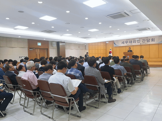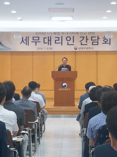 남대구세무서(서장 이동찬)는 2019년 7월 9일 2019년 1기 확정 부가가치세 신고 관련 세무대리인 간담회를 개최하였습니다.부가가치세 신고 간담회에 이동찬 남대구세무서장이 참석하여 부가가치세 신고에 대하여 상세히 설명하고 신고시 유의할 점에 대해 안내하였습니다.