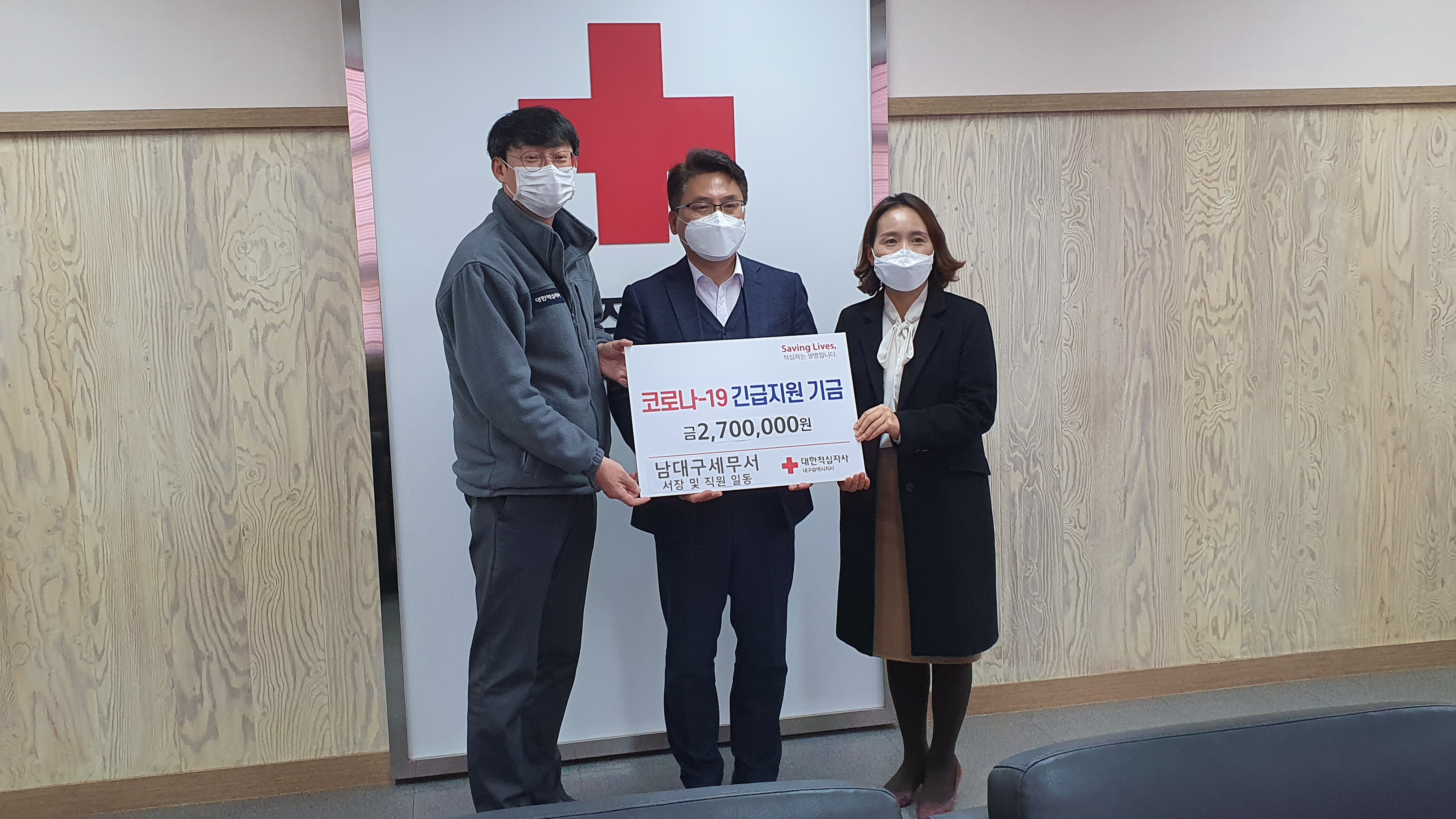 남대구세무서(서장 남영안)은 3월 5일 대한적십자사를 방문하여 후원금을 전달하였습니다. 코로나-19로 어려움을 겪고 있는 분들에게 도움을 드릴 수 있도록 최선을 다하겠습니다.