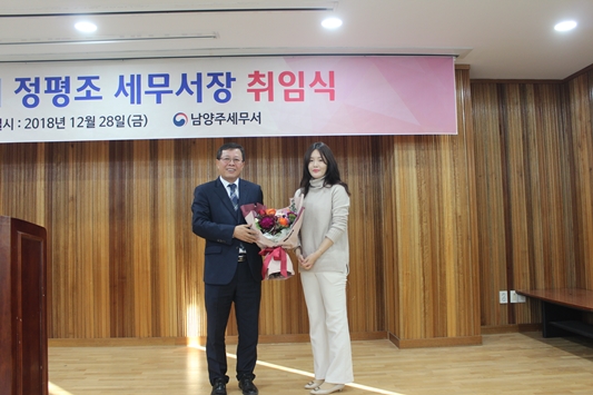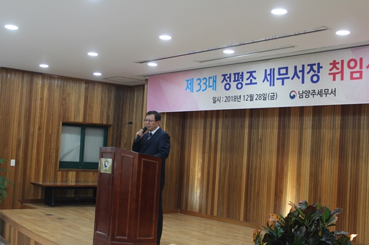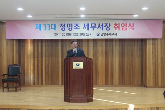 2018.12.28.(금) 남양주세무서 제33대 정평조 세무서장이 취임하였습니다.정평조 서장은 '공평한 과세', '지역경제 활성화에 도움이 되는 세정'등을 최우선으로 강조하였으며,아울러 다가오는 기해년 황금돼지해에는 활기찬 직장을 만들기 위해 직원 모두 노력해 줄 것을 당부하였습니다.