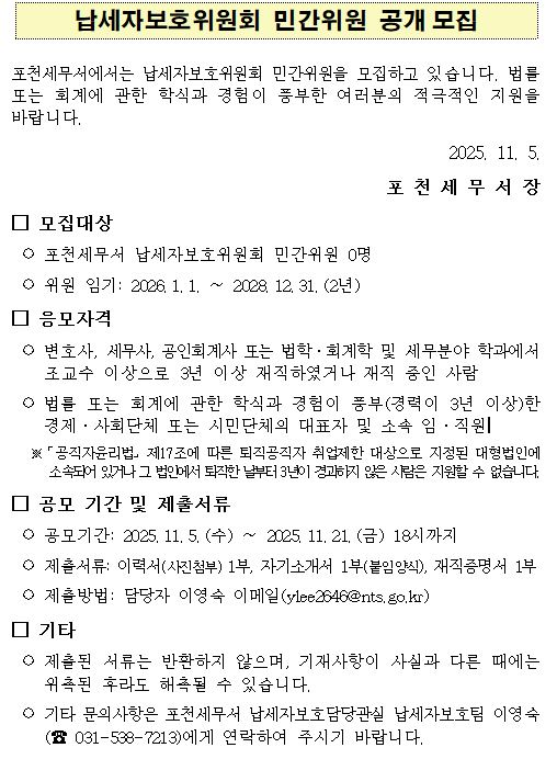 포천세무서 납세자보호위원회 민간위원 공개모집 안내