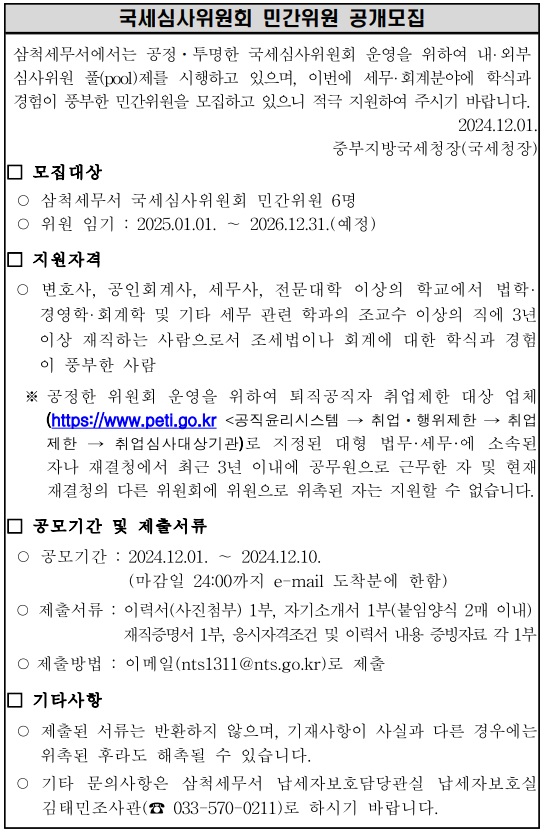 우리서 국세심사위원회 민간위원 선정을 위하여 붙임의 모집공고를 게시합니다.