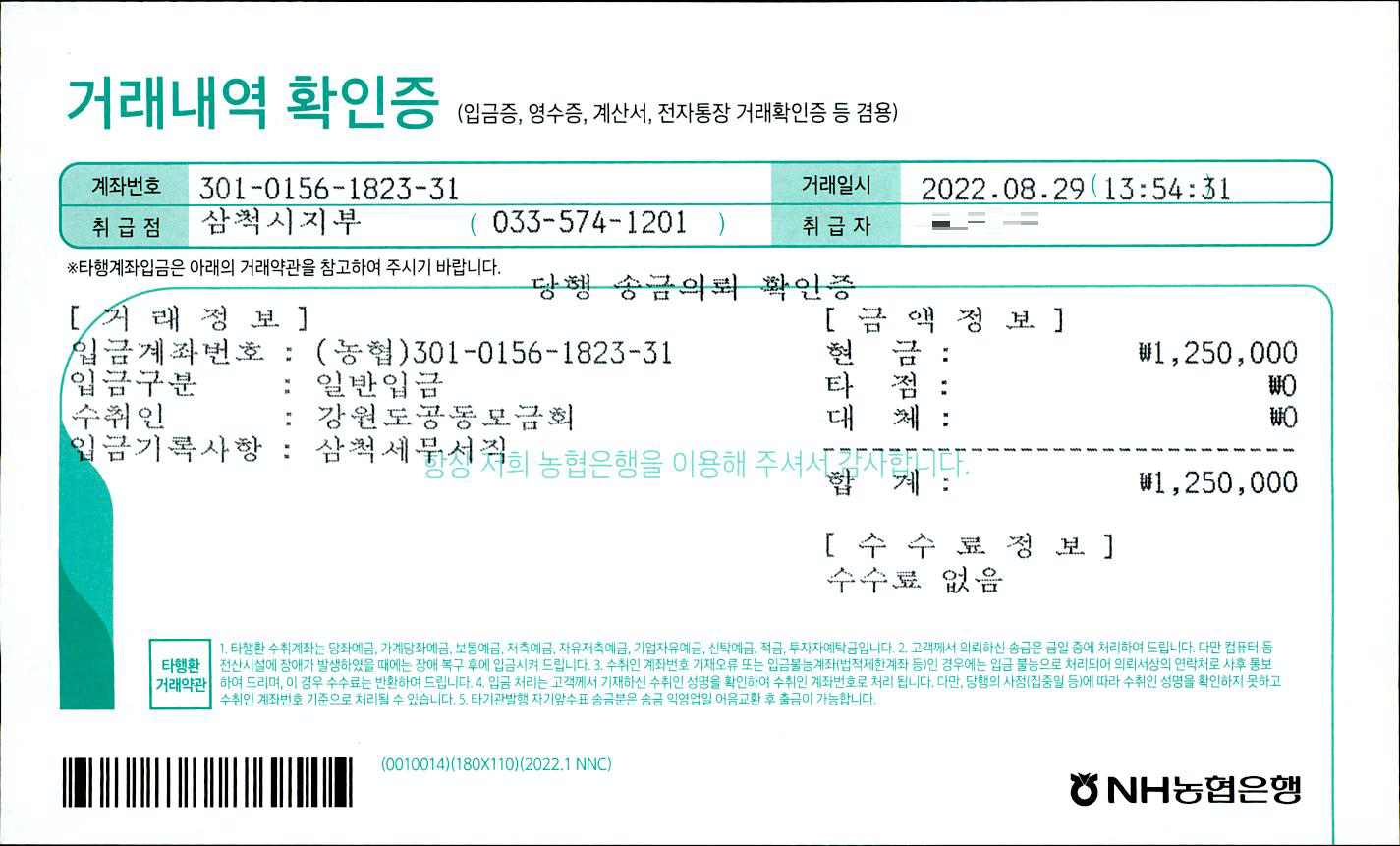 자발적 참여로 모여진 성금을 강원도 '사회복지공동모금회' 의 집중호우피해자 특별모금 계좌에 입급하였습니다.