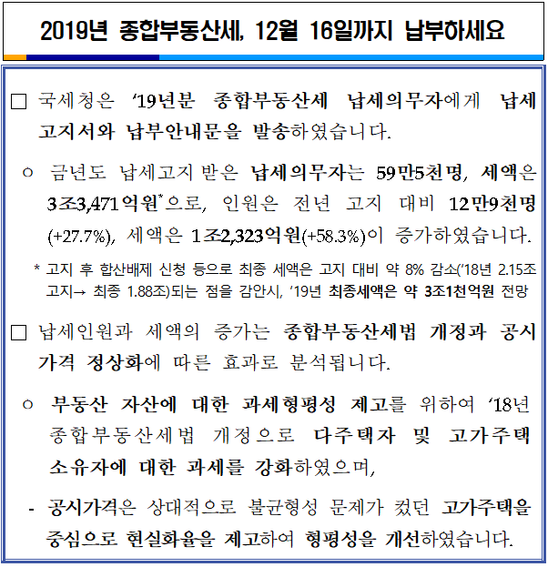 2019년 종합부동산세, 12월 16일까지 납부하세요