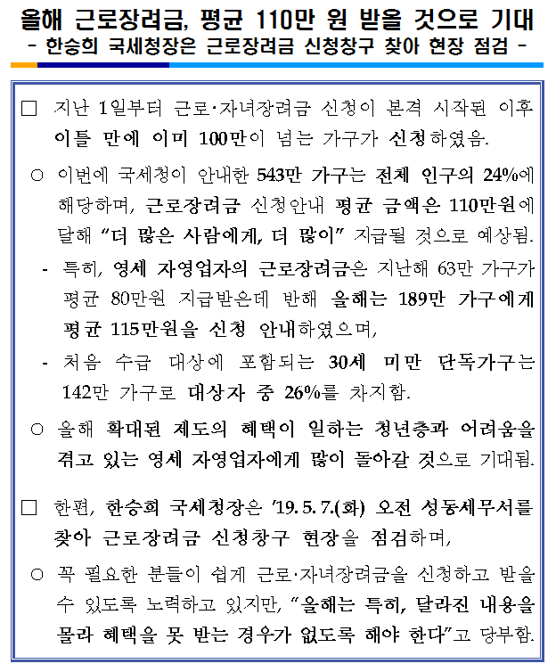 190507 올해 근로장려금_평균 110만 원 받을 것으로 기.hwp
