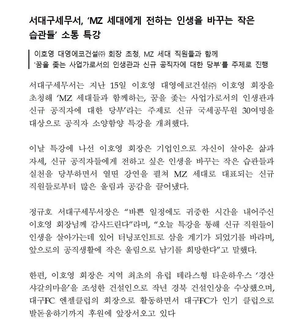 서대구세무서, ‘MZ 세대에게 전하는 인생을 바꾸는 작은 습관들’ 소통 특강