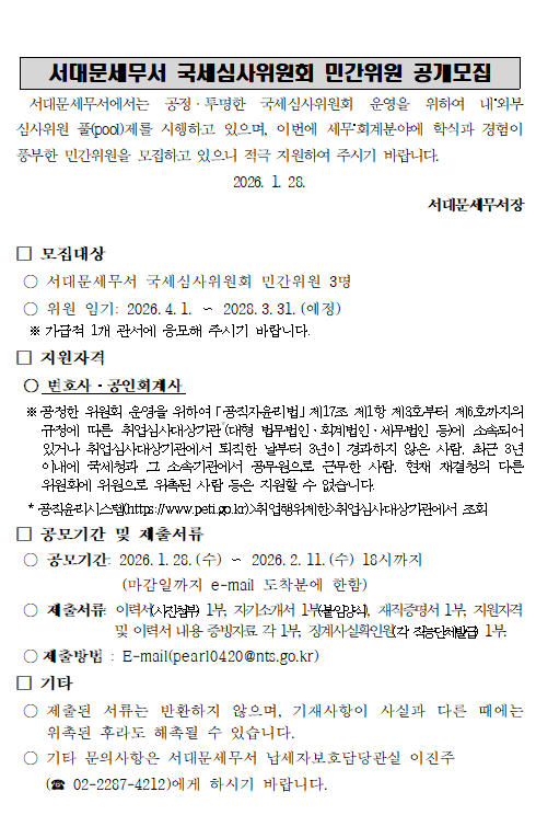 서대문세무서 국세심사위원회 민간위원 공개모집