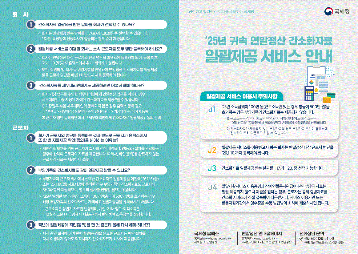 - 국세청은 근로자가 직접 홈택스에서 내려받아 회사에 제출하던 연말정산 간소화자료를 국세청이 회사에 직접 제공하는 「일괄제공 서비스」를 시행하고 있습니다.