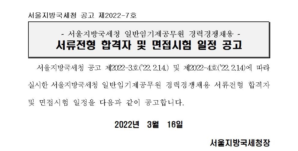 서울지방국세청 일반임기제공무원 경력경쟁채용 서류전형 합격자 및 면접시험 일정 공고입니다. 서울지방국세청 공고 제2022-3호 및 제2022-4호에 따라 실시한 서울지방국세청 일반임기제공무원 경력경쟁채용 서류전형 합격자 및 면접시험 일정을 다음과 같이 공고합니다. 2022년 3월 16일 서울지방국세청장