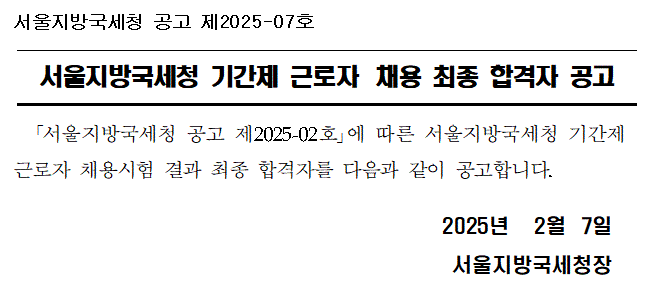 서울지방국세청 기간제 근로자 채용 최종 합격자 공고입니다. 서울지방국세청 공고 제2025-02호에 따른 서울지방국세청 기간제 근로자 채용시험 결과 최종 합격자를 다음과 같이 공고합니다. 2025년 2월 7일 서울지방국세청장
