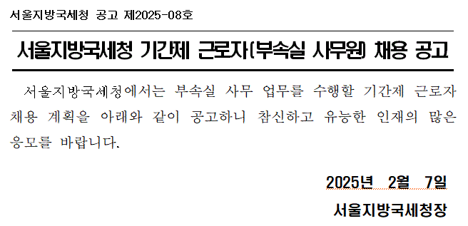 서울지방국세청 기간제 근로자(부속실 사무원) 채용 공고입니다. 서울지방국세청에서는 부속실 사무 업무를 수행할 기간제 근로자 채용 계획을 아래와 같이 공고하니 참신하고 유능한 인재의 많은 응모를 바랍니다. 2025년 2월 7일 서울지방국세청장