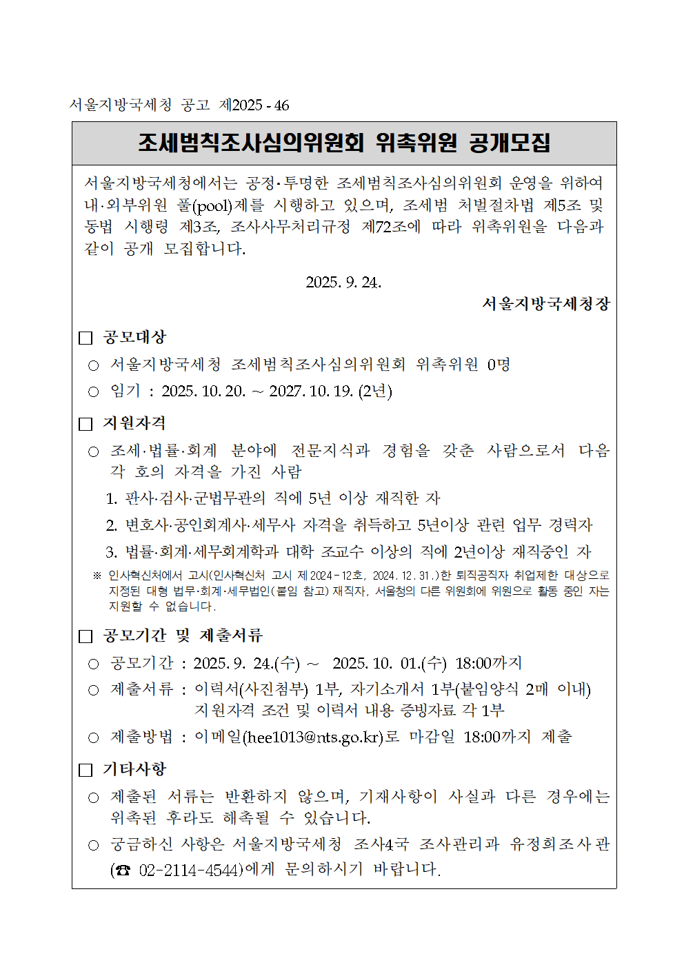 서울지방국세청 공고 제2025-46호 입니다. 조세범칙조사심의위원회 위촉위원 공개모집입니다. 서울지방국세청에서는 공정,투명한 조세범칙조사심의위원회 운영을 위하여 내,외부위원 풀제를 시행하고 있으며, 조세범 처벌절차법 제5조 및 동법 시행령 제3조, 조사사무처리규정 제72조에 따라 위촉위원을 다음과 같이 공개 모집합니다. 2025년 9월 24일 서울지방국세청장