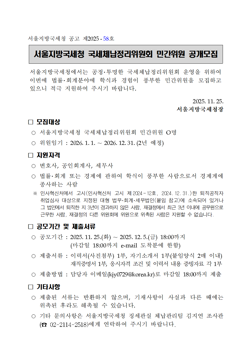 서울지방국세청 공고 제2025-58호 국세체납정리위원회 민간위원 공개모집 공고입니다.
