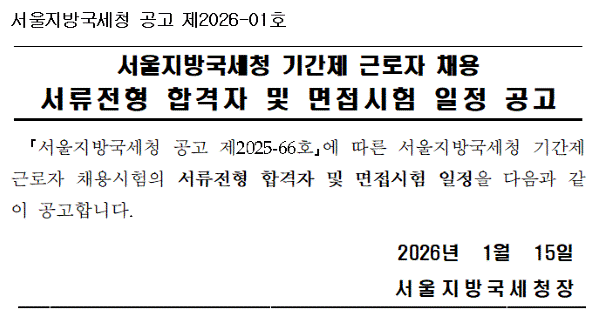 서울지방국세청 공고 제2026-01호 입니다. 서울지방국세청 공고 제2025-66호에 따른 서울지방국세청 기간제 근로자 채용시험의 서류전형 합격자 및 면접시험 일정을 다음과 같이 공고합니다. 2026년 1월 15일 서울지방국세청장