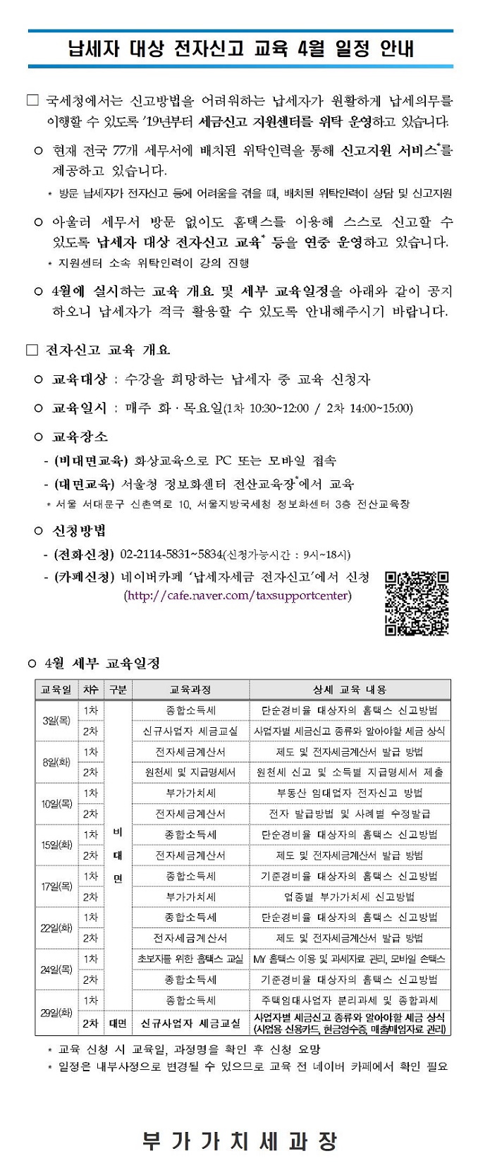납세자 대상 전자신고 교육 4월 일정 안내