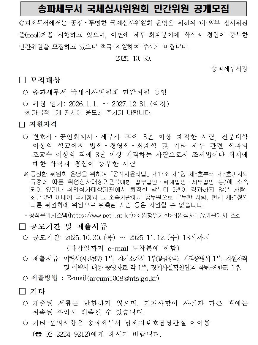 송파세무서 국세심사위원회 민간위원 공개모집 공고문.hwpx