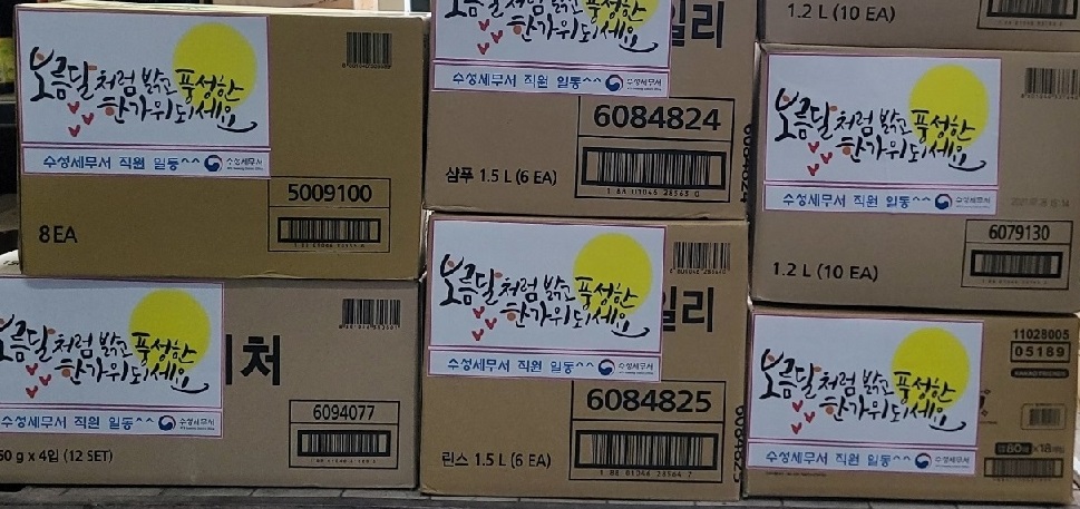 수성세무서(서장 백종찬)은 지난 16일 애망원에 후원 물품을 전달했다. 민족대명절인 추석을 맞아 코로나 19로 힘들어진 장애 아동을 돕기 위해 각종 생필품을 전달했다.
