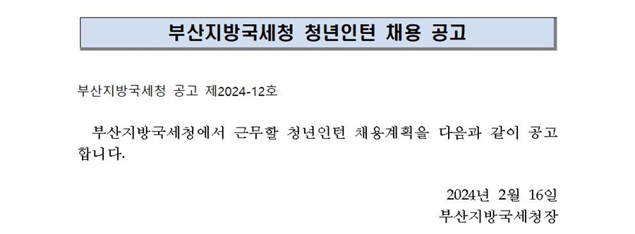 부산지방국세청 청년인턴 채용공고