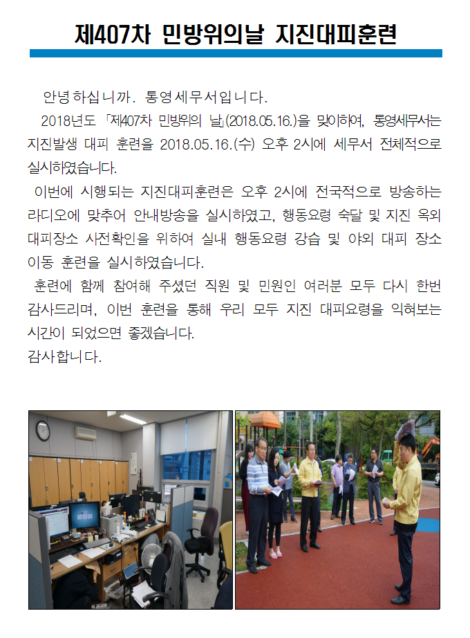 (2018.05.16)「제407차 민방위의날」지진대피훈련