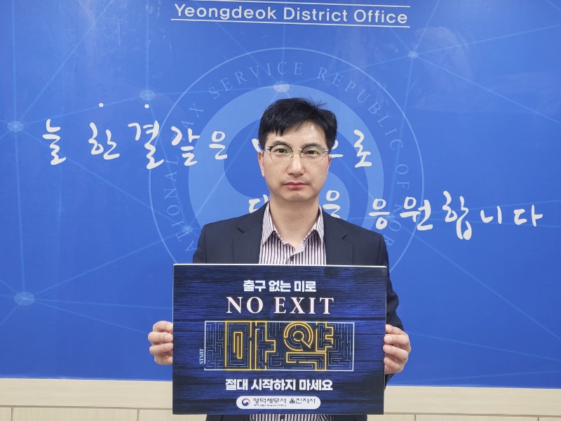 영덕세무서 울진지서(지서장 권성구)는 2023년 5월 22일 마약범죄 예방을 위한 ‘NO EXIT(출구없음)’ 릴레이 캠페인에 동참하였습니다.