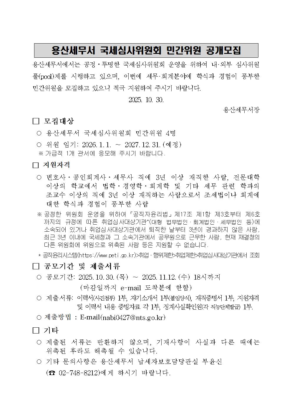 용산세무서 국세심사위원회 민간위원 공개모집