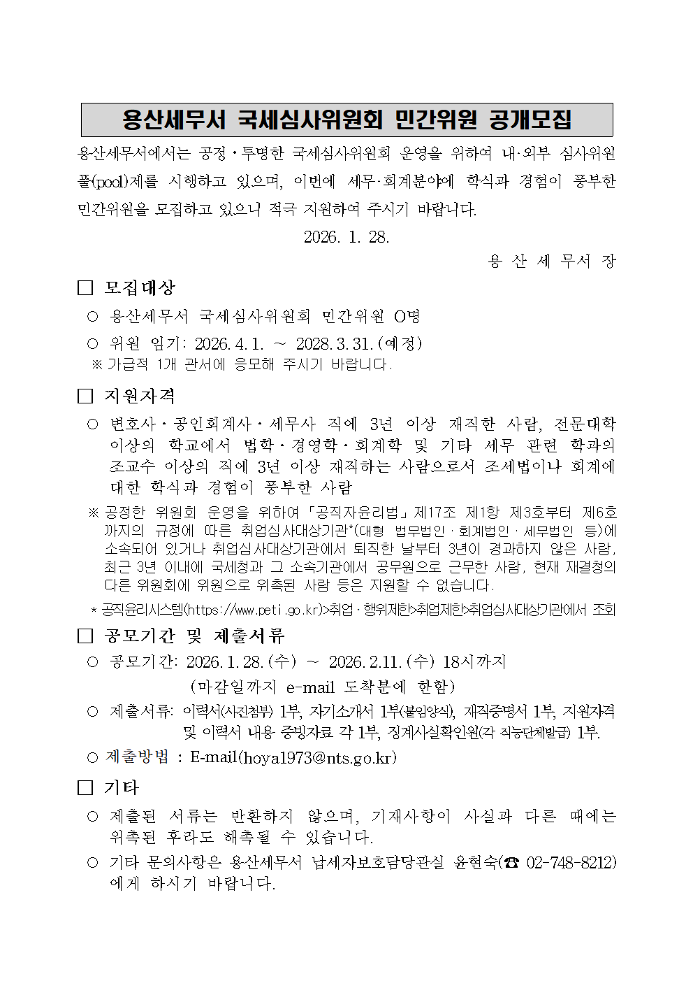 용산세무서 국세심사위원회 민간위원 공개모집 공고문(26.1월).hwp